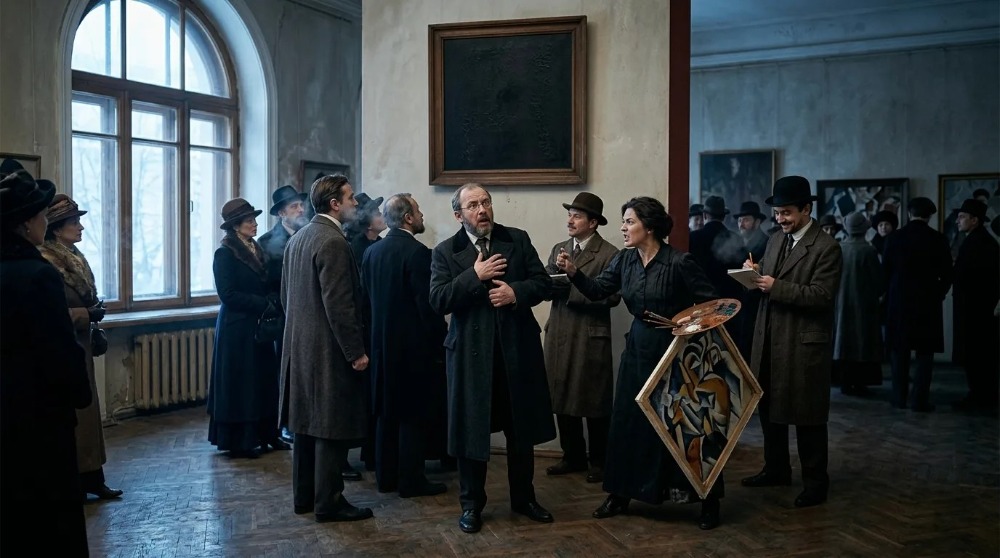 Декабрь 1915 года, Петроград. Открывается выставка «0,10» (Малевич представил там свои главные работы). Организаторы и не подозревают, что сейчас случится искусствоведческий ядерный взрыв.